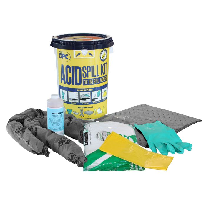 Deze interventiekit bevat polymeren die chemicaliƫn neutraliseren om gemorste vloeistoffen veilig op te ruimen, met een indicator die van kleur verandert bij neutralisatie. Geschikt voor het veilig opruimen van de meeste zuren (inclusief batterijzuur op gladde oppervlakken).