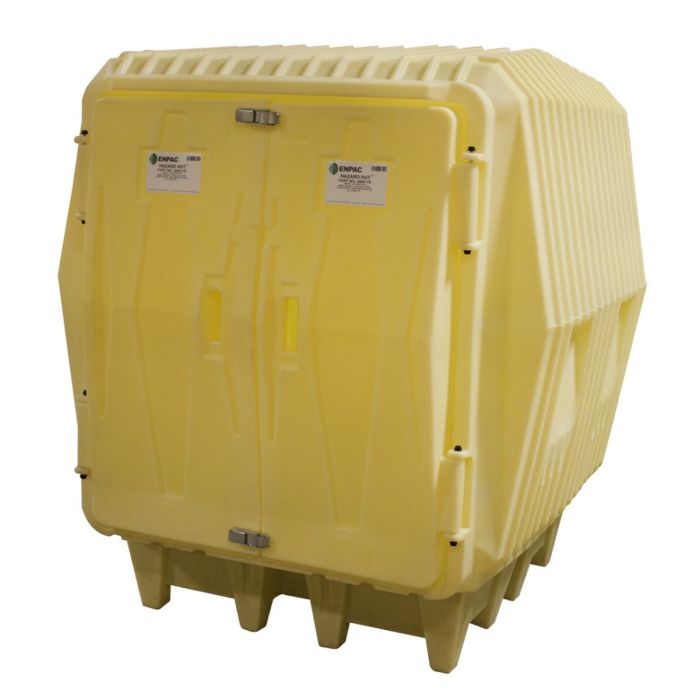 The solution to your indoor storage problem is outdoor containment. The Hazard Hut can store up to four 55-gallon drums and is constructed from rugged, UV resistant polyethylene. The one-piece molded frame is weather proof, while the hinged doors are lockable for added security.