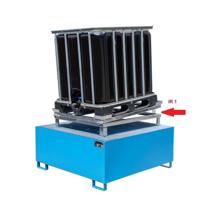 IR-1: kiepframe met veiligheidshoeken, steunpoten. Geschikt voor montage op een stalen IBC-lekbak.
