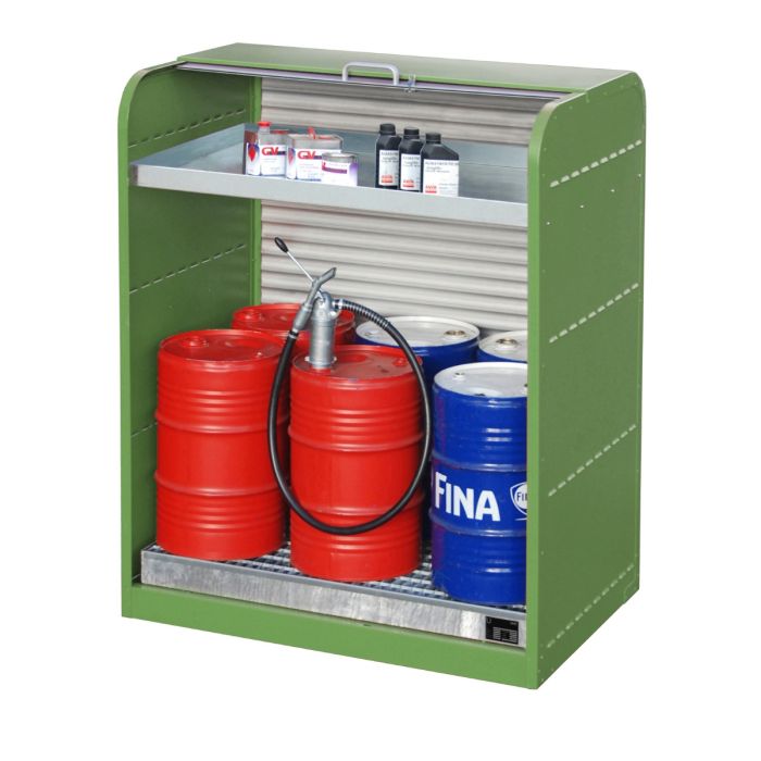 Staal gelakte opslagdepot met roldeur - voor 6 vaten à 60 liter en kleinverpakkingen