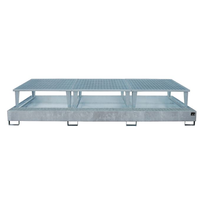 Staal verzinkte IBC lekbak voor 3 IBC / KTC van 1.000 ltr. Voor een veilige opslag van verpakte gevaarlijke stoffen overeenkomstig PGS 15 (voorheen CPR 15-1), VLAREM, ARAB, CODEX